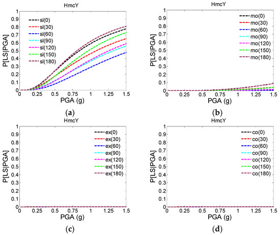 Seismic fragility curves of HmcY subjected to different excitation angles in the (a) slight; (b) moderate; (c) extensive; and (d) complete limit states.
