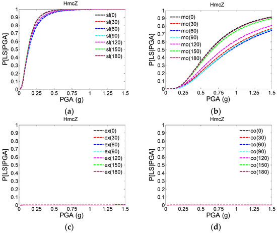 Figure 5 demonstrates that the fragility of the column reaches a minimum when the excitation angle is 30 degrees, whereas fragility curves are essentially coincident when subjected to any other angles. Figure 6 indicates the fragility of Abb is lowest when the excitation angle is 30 degrees, nevertheless the fragility is highest when the excitation angle is 90 degrees. Figure 7a–c shows the fragility of Hs reaches a minimum when subjected to 180 degrees, whereas fragility reaches a maximum when subjected to 90 degrees. Figure 8a,b and Figure 9a,b indicates HmcY and HmcZ features the minimum fragility when subjected to 60 degrees, whereas it features the maximum fragility when subjected to 180 degrees.