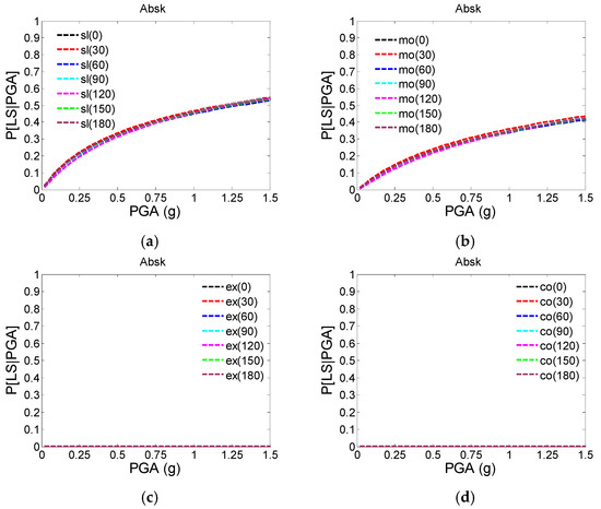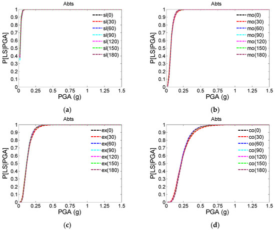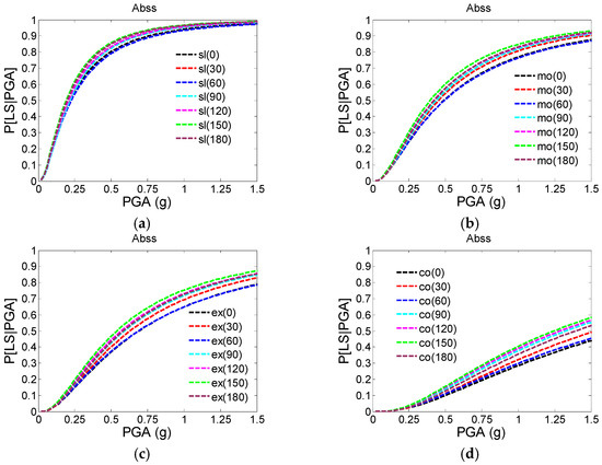 Seismic fragility curves of Absk subjected to different excitation angles in the (a) slight; (b) moderate; (c) extensive; and (d) complete limit states.