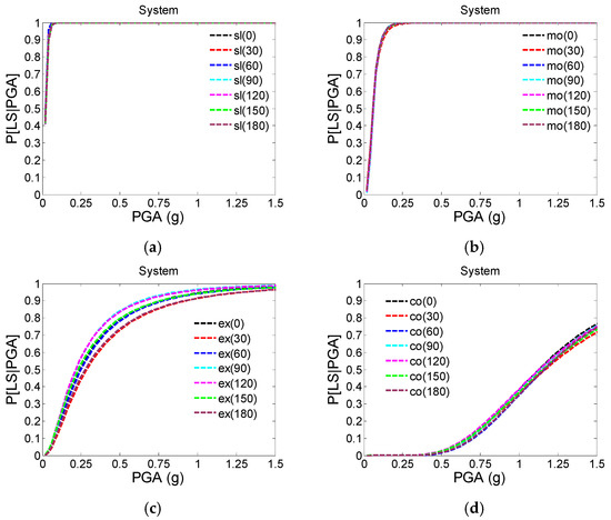Before the earthquake, the seismic excitation angle is frequently random and unpredictable, whereas the angle above can be monitored through a seismic monitoring system after the earthquake. As a matter of course, the most vulnerable parts, and the overall damage state of the bridge, can be assessed immediately through seismic monitoring data on the condition that the relationship between seismic fragilities and excitation angles can be established, and the most unfavorable excitation angles can be acquired. In order to obtain the above relationship and the most unfavorable excitation angles, the seismic loads, having the excitation angles ranging from 0 to 180 degrees as the interval of 30 degrees, are applied to the bridge model, shown in Figure 2a. Subsequently, 48-time history analyses are performed under every excitation angle, and a total of 336 analyses are performed under seven excitation angles. The fragility curves for components and the bridge system are shown in Figure 5, Figure 6, Figure 7, Figure 8, Figure 9, Figure 10, Figure 11, Figure 12 and Figure 13. For the sake of enhancing stereo perception, the three-dimensional fragility surfaces, used to describe the relationships between seismic excitation angles and fragility curves, are illustrated in Appendix A.