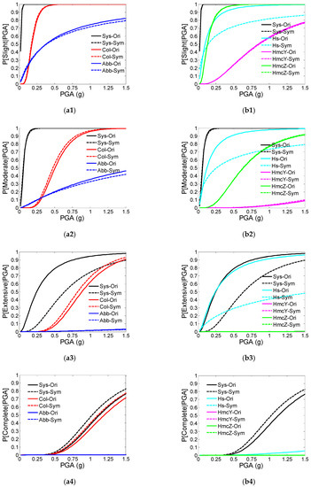 As indicated in Figure 14a2–a4, in the moderate, extensive and complete limit states, the fragility of the column for the symmetrical model is higher than that for the asymmetric model. This is because the symmetrical model, having shorter columns, exhibits greater seismic response of columns and then leads to the higher damage risk to columns.