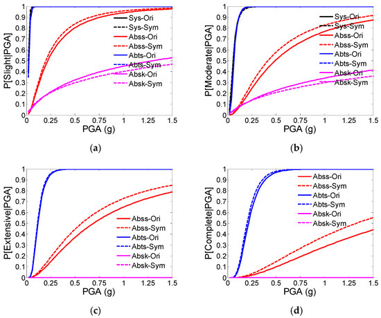 Seismic fragility curves of the bridge system and secondary components for the original model and symmetric model: Abss; Abts; Absk in the (a) slight; (b) moderate; (c) extensive; and (d) complete limit states.