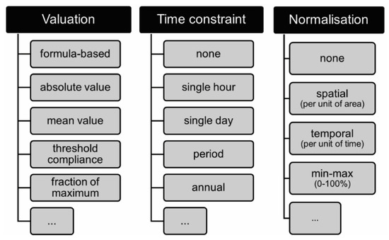 The characteristics of metrics identified in Figure 1 are further explored in this section (Figure 2). Metrics are characterised by the way in which they are valuated, which time constraint is considered in calculations, and which method of normalisation that is used, if any. The metric characteristics should thus be viewed as prescribed metric formulation principles. A non-exhaustive list of examples of the metric characteristics can be found in Figure 2. One or more characteristics can be relevant, e.g., valuation can be based on the mean value principle and also be given a criterion threshold.