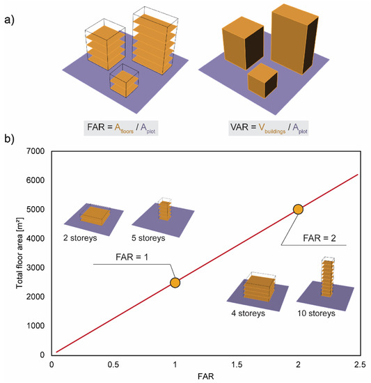 Floor Area Ratio (FAR), illustrated in Figure 4a, is a G metric expressing compactness or urban density as a ratio of gross floor area of buildings to their site area [42]. It has also been called floor space index [43] or plot ratio [44]. It has been widely used as a measure of density in various urban studies [26,33,34,45,46,47]. Figure 4b displays some possible variations in building shape and height for two example values of FAR.
