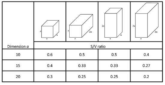 Surface-to volume (S/V) ratio has been used in research as a measure of building compactness [57,58,59]. It may also be called building aspect ratio [43]. The metric was originally introduced as an inverse (V/S) [60]. Example values of the metric can be found in Figure 5. For high compactness levels, smaller values of the metric are desired, while large values express low compactness. The S/V ratio metric showed low correlation with PV-generated electricity from building envelope and with energy use [18]. A common implication of the S/V ratio metric for the building design performance is the reduced heat loss from the building envelope the higher the compactness. However, the S/V ratio is never used as a lone performance indicator, because if the sole design objective would be to maximise compactness, then a significant loss of daylight and sunlight indoors would occur [59]. It can be seen in Figure 5 that bigger volumes with larger edge dimensions yield lower S/V values, i.e., higher compactness, as the centre of gravity of the forms moves further away from their external boundaries.