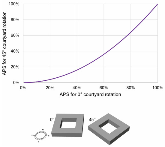 An example analysis of the APS metric in an enclosed square courtyard ground surface (Figure 5) reveals an intrinsic relationship: for a given building geometry, the value assumed by the metric is different depending on the orientation of the courtyard building, and follows an exponential function shown in Figure 6, as APS45° = (APS0°)2. It occurs because solar access to a courtyard, which is here expressed by APS area, is dictated by the highest position of the sun on the reference day, i.e., solar altitude at noon. Concurrently, it was found that the orientation of the same courtyard geometry does not affect cumulative solar radiation received by the facades of the courtyard. It is, therefore, indeed questionable whether the metric is adequate for quantifying solar access. Moreover, the metric has not been found in scientific literature.