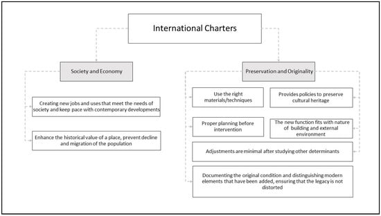 Conservation policies for heritage buildings and antiquities vary. Some require preserving and protecting the buildings as they are, without any interference, while some require modifications. Among the intervention policies are conservation, restoration, rehabilitation, maintenance, air conditioning, and others. A number of international references emphasize the principles and policies of implementing these interventions, interspersed with a number of charters, such as the Athens Charter of 1931 AD, the Venice Charter of 1964 AD, and the Dubai Charter of 2004 AD (the first charter in the Arabic language for heritage buildings) [23]. The researchers focus on eliciting points that serve the concept of adaptive reuse, and the charters include various focal points. one of which is the end goal of intervention policies—to preserve buildings—as they are considered economic resources that contribute to meeting the needs of society and strengthening the identity and sustainability of cultural heritage. The researchers summarize the main points of the charters, and they propose to divide them into two axes: preservation and authenticity, and society and economy (see Figure 2).