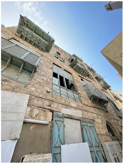 Historic Jeddah is considered a cultural and architectural heritage that is part of the identity of the Kingdom of Saudi Arabia [1]. With the passage of time, the importance of Jeddah increased, and it became one of the largest cities in the Kingdom. Historic Jeddah was inscribed on the World Heritage List on 21 June 2014, with its architectural features adding to its historical value, such as the use of prospective stone and wood in the construction of the bearing walls, and the old buildings’ innovative and artistic solutions to adapt to the harsh climatic conditions of the region (see Figure 4) [1]. For example, the roofs perform many functions at the same time: providing privacy, purifying the air, and providing thermal comfort. The high rises of these buildings face the north and west winds. The aesthetic element that decorates the facades and architectural design is characterized by open spaces and zigzag structures that offer protection from sunlight [16]. The uses of these buildings over time varied; however, over time their use was subjected to many changes that led to unplanned technical repairs and restoration operations. It is necessary to study their future use to propose appropriate repair and restoration solutions that will help restore prosperity to the area and buildings without repeating previous mistakes [31].