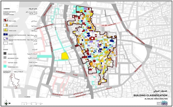 The Saudi Commission for Tourism and Antiquities and the Ministry of Tourism currently classify all urban heritage sites and buildings and their areas into three grades: Category (A) for buildings and sites of high importance, Category (B) for buildings and sites of medium importance, and Category (C) for buildings and sites of little importance. These classifications include the building or site, antiquities and movable parts within (such as paint, windows, doors, and others), urban areas comprising several buildings, villages, cities, neighborhoods, all surrounding buildings and areas whose presence is included in the protection of the building, and, finally, the surrounding natural areas [24]. This classification was also approved according to the Antiquities, Museums, and Urban Heritage System by a royal decree that is in effect at the time of writing this [25].