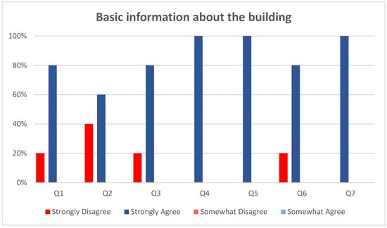 Participants’ answers were coded as strongly agree (+2), somewhat agree (+1), strongly disagree (−2), and somewhat disagree (−1) for easy reading of the results. The first axis consists of basic information related to the building in terms of ownership, function, age, location, and classification from the competent authorities, as shown in Table 2. The results are shown in Figure 6.