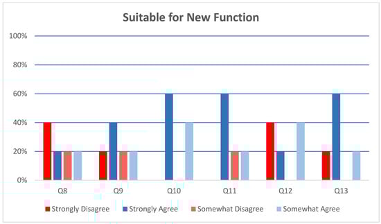 This element consists of a set of questions related to the function chosen for the building, with respect to the building’s history, durability, and accessibility, as shown in Table 3. The results are shown in Figure 7.