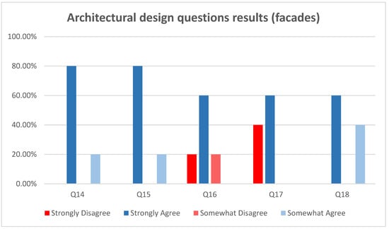 This element consists of sub-elements related to building facades, openings, and materials used in construction and finishing. It investigated whether the properties of the materials used were compatible with those of the original materials of the building [10], if the new element was distinct from the old, and if the new function was suitable for the building’s structural durability [9,10]. The questions related to the facade investigated additions made to it and its possible effects on the buildings and its external surroundings, as shown in Table 4. The results are shown in Figure 8.