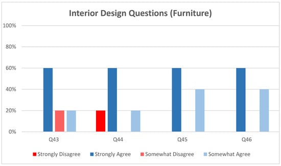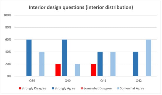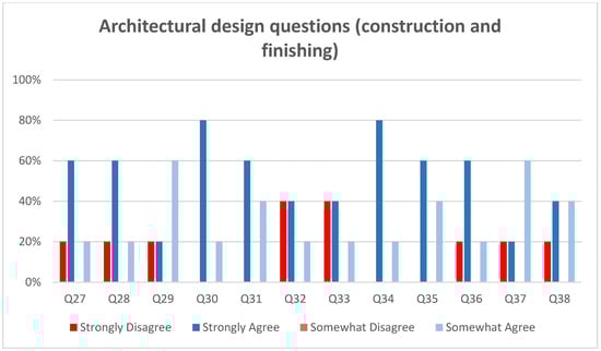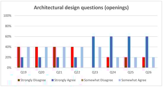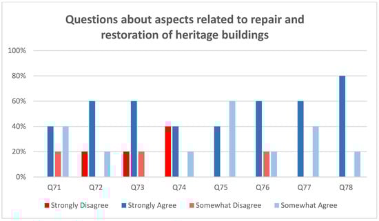 For Questions 19–22, there is an equal percentage of those who strongly disagreed and those who somewhat agreed. For Questions 23–26, 60% strongly agreed. However, there remained some who strongly disagreed. The formulation of the questions may have led to a lack of clarity for the person conducting the assessment. As for the questions dealing with changes to openings, doors, and arches, the opinion of participant A2 was that “No changes should be made to heritage buildings”. This supports the importance of including these questions in the checklist to ensure the authenticity of the building.