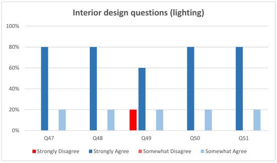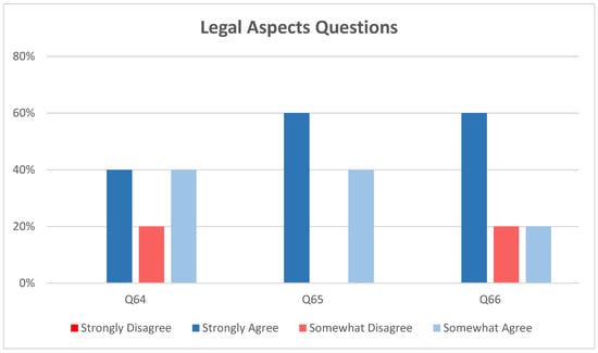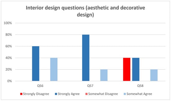 The majority of the participants strongly agreed with Question 56, with participant A3 suggesting adding a box with further detail. For Question 57, 80% strongly agreed and 20% somewhat agreed, which was participant A3′s choice, for the same reason as the previous question. The lowest percentage of agreement was for Question 58 at 60%, and 40% did not agree with the question at all. Participant A3 had the same reason, citing the addition of a box for detail. Participant A1 justified this choice of not agreeing at all by saying, “It is not necessary to enter this item in the process of evaluating the reuse of heritage buildings”.