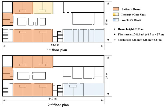 Figure 2 shows the floor plans of a typical nursing hospital used as a prototype in this study. The target building had two floors and ten rooms for patients on each floor. The floor area was 3493.8 m2, and the room height was 2750 mm. In this study, egress safety was evaluated by comparing the RSET and ASET. Egress simulations were performed using Pathfinder [27], a program that predicts egress behaviors based on the occupant characteristics using an agent-based model. The time required for all occupants to egress the building (RSET) was determined. In addition, fire simulations were performed using FDS [28], a model developed by the National Institute of Standards and Technology. The time when the main factors (temperature, visibility, CO, O2, CO2) exceeded the value specified in the life safety code (ASET) was determined. Table 1 lists the tenability criteria presented by the National Fire Protection Association [29] for the main factors affecting the safety of occupants during a fire event. In this study, the time required for visibility, CO, CO2, O2, and temperature to reach each tenability criterion was computed using the FDS analysis results, among which the lowest value (ASET) for the prototype nursing hospital was determined.