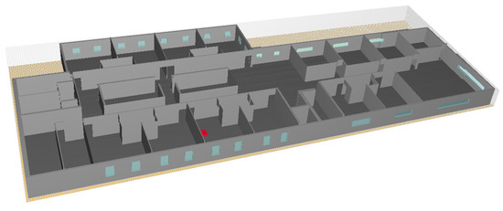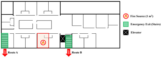 Figure 3 shows the fire combustion location assumed for the fire simulation and egress routes, and Figure 4 shows the FDS model used for the fire simulation. It was assumed that a fire occurred on the second floor of the prototype nursing hospital, and two stairs and an elevator were set as the egress routes. An egress using elevators is generally prohibited in case of a fire emergency. For nursing hospitals, however, a significant number of occupants use wheelchairs or beds to egress (i.e., aided-egress), so some countries allow the use of emergency elevators with strict conditions, for instance, a completely separate operation in any conditions.