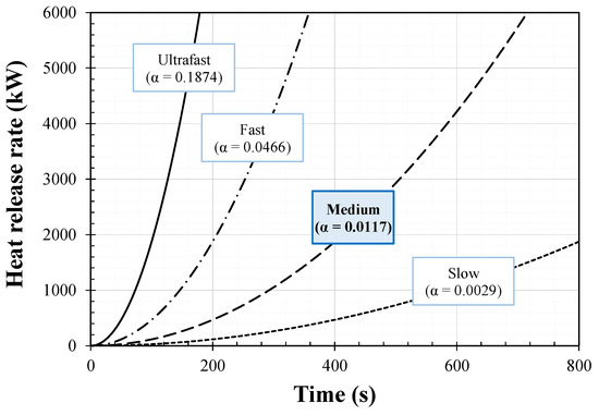 Based on Equation (1), 0.25 m × 0.25 m × 0.27 m was applied as the mesh size. In Equation (1), is the total heat release rate of fire (kW), is the density of air (1.204 kg/m3), is the specific heat (1.005 kJ/kg-K), is the ambient temperature (293 K), and is the acceleration due to gravity (9.8 m/s2). The values specified in the Society of Fire Protection Engineers handbook [30] were adopted as the physical properties of the fuel. The combustibles were assumed to be beds, tables, and chairs, and the heat release rate of each combustible was calculated according to the database [31] of the National Center for Forensic Science. To assume the concentration of smoke and toxic gases generated during combustion as the worst case, polyurethane foams [32,33] with the highest soot yield and CO yield values have been set as the fuel type. The heat release rate () in terms of time was calculated using Equation (2) to simulate the t-squared fire curves shown in Figure 5:
