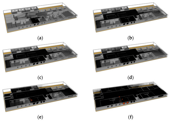 Figure 6 depicts the smoke behavior for the fire duration () of each fire compartment on the second floor where the fire broke out. As shown in Figure 6a, smoke spread from the fire area to the hallway approximately 100 s after the fire started. The hallway on the second floor was filled with smoke approximately 300 s after the fire, and the smoke spread to the entire second floor at approximately 500 s.