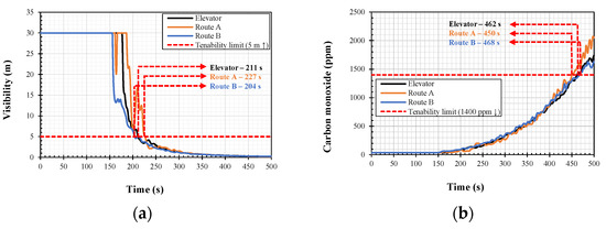 Figure 7 shows the simulation results (visibility, CO, CO2, O2, and temperature) for the fire duration () for each egress route (Route A, Route B, and the elevator) shown in Figure 3. In the graphs, the red dotted lines indicate the tenability criteria listed in Table 1; that is, the time at which each piece of data intersects the red dotted line in the graph becomes the ASET for each factor. Figure 7a shows the visibility simulation results for the fire duration () in which the tenability limits were reached in the following order: Route B (204 s), the elevator (211 s), and Route A (227 s). Therefore, the ASET for visibility was 204 s (Route B). Figure 7b shows the simulation results for CO. The tenability limits were reached in the following order: Route A (450 s), the elevator (462 s), and Route B (468 s). Therefore, the ASET for CO was 450 s (Route A). Figure 7c,d show the simulation results for CO2 and O2, respectively. For these parameters, the tenability criteria for all egress routes were not satisfied. Figure 7e shows the temperature analysis results. The maximum temperatures of the egress routes were 50 °C (elevator), 55 °C (Rout A), and 46 °C (Route B). The simulation results for the visibility, CO, CO2, O2, and temperature based on the fire duration () showed that the ASET was predominantly determined by a decrease in visibility, owing to the spread of smoke. The ASET of the prototype nursing hospital was 204 s.