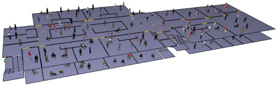Figure 8 shows the Pathfinder model for the egress simulations. For the egress simulations, the number of total evacuees, velocity of evacuees, width of evacuees, and preparing time for evacuees in the prototype buildings were input in the model. The Enforcement Rule of Welfare of Senior Citizens Act [35] in South Korea prescribes that an area of at least 23.6 m2 per patient must be secured. Therefore, the number of patients was assumed to be 150, considering the area of the prototype building. Based on the health status of a patient, the patient’s severity can be classified into levels, such as “medical highest,” “medical high,” “medical middle,” “medical low,” and “etc.” In this study, the number of patients according to the severity was assumed as shown in Table 3, based on the severity ratio according to inpatient classification of nursing hospitals by the Ministry of Health and Welfare, South Korea [36]. Table 4 lists the number of patients according to egress type. It was assumed that, during a fire event, 41 patients whose severity was categorized as “etc.” could egress on their own by walking, and 34 patients with “medical low” severity could egress themselves in wheelchairs. The number of patients that could egress in wheelchairs with the assistance of an egress guide was assumed to be 59, considering all the patients with “medical middle” status and some patients with “medical high” status. However, 16 patients were assumed to be evacuated in their beds with the help of an egress guide because the patients could not move.