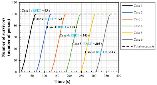 Figure 9 shows the number of survivors when the number of total evacuees was 185, with the delay time as a variable. At this time, the number of patients was 150, number of egress guides was 35, and number of evacuees on the second floor was 100. Because the number of total evacuees was constant, and the egress patterns were similar, all the graphs showed similar trends, and each result was an offset form based on the delay time. The time at which everybody completed the egress was selected as the RSET for each case.