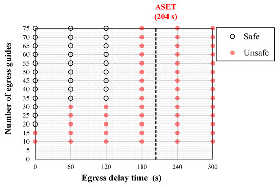 Table 8 lists the number of people who failed to egress when the ASET was 204 s in each case. When the number of egress guides was 10, four people failed to egress even after egression commenced immediately after the fire broke out (that is, when the delay time was 0 s). When the number of egress guides increased to 20, everybody egressed only when the delay time was 0 s, whereas four people failed to egress when the delay time was 60 s. When the delay time was maintained, the number of people who failed to egress decreased as the number of egress guides increased. Because the ASET was 204 s, everybody failed to egress when the delay time exceeded 240 s. When the delay times were 240 and 300 s, the number of people who failed to egress increased with an increasing number of egress guides; the number of total evacuees tended to increase when the number of egress guides increased.