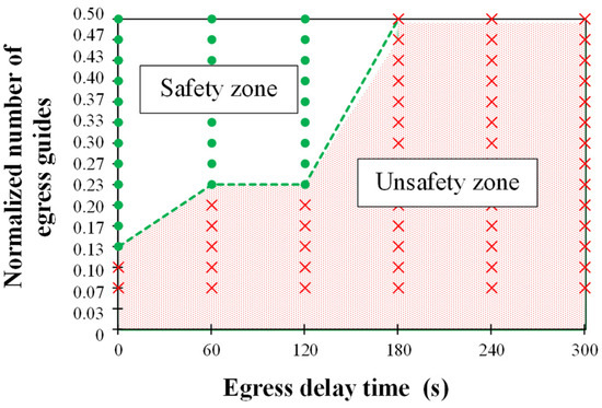 Figure 10 shows the egress safety evaluation results for each case. The x- and y-axes represent the delay time and the number of egress guides, respectively. When all the occupants egressed successfully, the situation was considered safe; it was considered unsafe even if one person failed to egress. The egression failed regardless of the delay time when the number of egress guides was 15. Therefore, it can be inferred that at least 20 workers should be on duty in the prototype nursing hospital, even during shiftwork and night duty. Furthermore, the number of egress guides required for successful egression rapidly increased with increasing delay time.