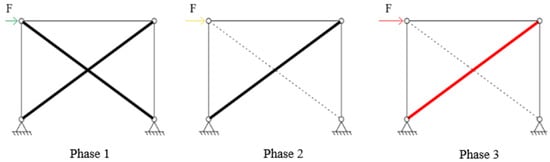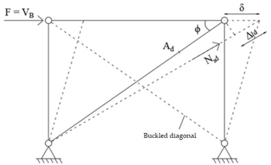 - In phase 2, the structure loses about half of its lateral stiffness because of the buckling of the compressed diagonal; by neglecting the contribution of this one, the lateral stiffness becomes ;
