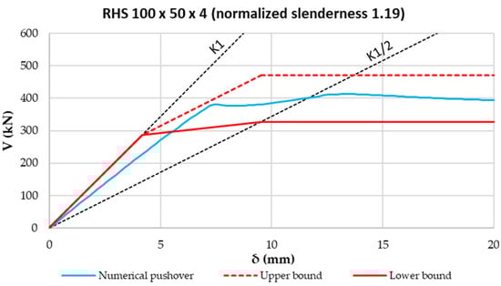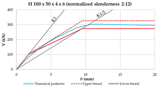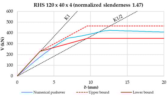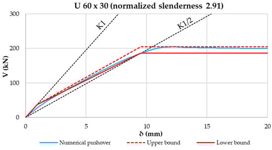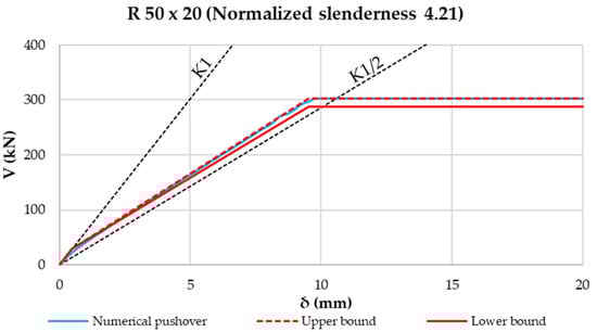 - Taking these aspects into account, the construction of an analytical pushover “spindle” was proposed, characterized by lower- and upper-bound curves. Such limit curves form a field in which numerical pushover curves have to fall. This was proven by using a model validated through experimental tests. By varying the diagonal profiles with different normalized slenderness, it was shown that numerical curves fall always inside the proposed pushover spindle. In addition, the higher the normalized slenderness of the diagonal is, the tighter the analytical spindle is.