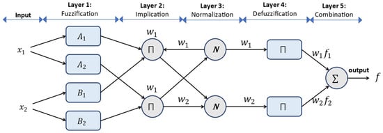 Layer 4. Each node in this layer represents an adapted node with a function node, and the contribution of each rule to the total output is calculated. It means that the output of the previous layer is multiplied by a function of the Sugeno fuzzy rule. In other words, defuzzification is done, and the output values are obtained from fuzzy inference rules, in which