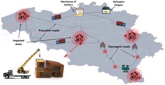 Consider a disaster-affected area. Humanitarian organisations have a plan to send temporary shelters to the affected areas using trucks and helicopters in response to this disaster. Multiple depots are considered in response operations, including the depot of heterogeneous trucks and the hangers of heterogeneous helicopters. It should be noted that the vehicle depot also serves as a shelter warehouse. These vehicles should deliver temporary shelters to demand points. However, due to the severity of the disaster, some infrastructures, including access roads to some of these points, have been disrupted, making ground delivery to these points impossible. As a result, the affected areas have been divided into two clusters in order to reduce the time it takes to send shelters. Because of the disruptions in the access roads, the affected points in one cluster can receive shelters in both ground and air modes, while the points in the other cluster can only receive shelters in an air mode due to the breakdown of their road. The points in each cluster are then prioritised separately by the key factors on route reliability. That is, in each cluster, the shelters are distributed first to the most reliable route, and the vehicles serve from the most reliable routes. On the other hand, during the distribution of shelters, the ground vehicle (e.g., truck) breaks down, causing its service areas to be served late and causing disruption in the distribution system (
