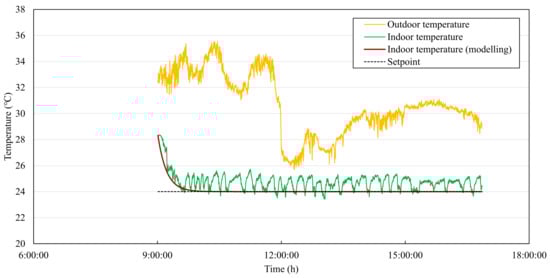 Figure 7. When the indoor temperature is cooled to a constant level while the outdoor temperature is changing, the predicted HVAC load is affected by the variation of outdoor temperature according to Equation (2). The load modelling results are consistent with the fluctuation of outdoor temperature. The measured HVAC load experiences the same rising and falling trend of the modelling results with periodic fluctuation, which is caused by the intermittent control of the electronic expansion valve. The modelling results have discrepancies with the measurement in the cooling process, which can only be solved by using a more accurate VRV model, but this does not affect analyzing and concluding this study. When the modelling load drops to the minimum value