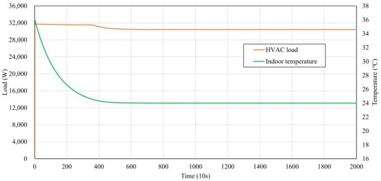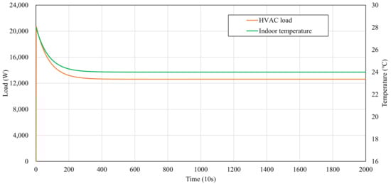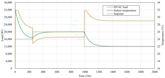 Figure 10. The setpoint is 24 °C at the beginning, the indoor temperature drops rapidly from 32 °C, while the load decreases after maintaining full power for a period of time. When the setpoint rises to 26 °C, the HVAC load drops rapidly because of the reduction of cooling demand and rebounds to 17.1 kW when indoor space reaches another thermal equilibrium. The HVAC load is 5.1 kW lower than 22.2 kW before regulating setpoint, which is about 16.0% of its rated load. When the setpoint drops to 22 °C, the HVAC load increases to maximum due to the surge of cooling demand. When the indoor thermal condition reaches equilibrium again, the HVAC load maintains 26.0 kW, which is about 28.3% of its rated load.