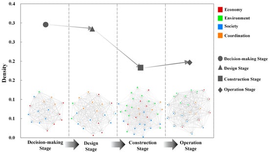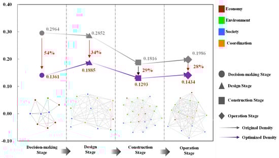 Second, the effectiveness of risk mitigation strategies is evaluated by calculating the network density of new networks and it is established that the network density decreases significantly, as shown in Figure 9. The network density in the decision-making stage decreases from 0.2964 to 0.1361, a 54% decrease; in the design stage, it decreases from 0.2852 to 0.1885, a 34% decrease; in the construction stage, it decreases from 0.1816 to 0.1293, a 29% decrease; and in the operation stage, it decreases from 0.1986 to 0.1434, a 28% decrease. The above results demonstrate that the complexity of risk networks can be significantly reduced by implementing mitigation strategies for the identified key risks and key risk relationships at each stage of the project.