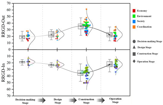 Figure 4 shows the evolution trend of RRGD-In and RRGD-Out with the life cycle of MIPs. In general, RRGD-Out and RRGD-In have similar change trends and increase after reaching a maximum in the construction stage. From the view of dimensions, RRGD-Out and RRGD-In of environmental and social risks both increase first and then decrease, reaching a peak in the construction stage, which is twice that of the other stages. This shows that environmental and social dimension risks play an important role in global source risk and global cumulative risk in the construction stage, because most of the nodes are linked to the risks of these two dimensions. The RRGD-Out of economic risk undergoes a small change in the whole life cycle, and the RRGD-In of economic risk is significantly higher at the construction stage. In contrast, the RRGD-In of coordination risk undergoes a small change in the whole life cycle, and the RRGD-Out of coordination risk is significantly higher at the construction stage.