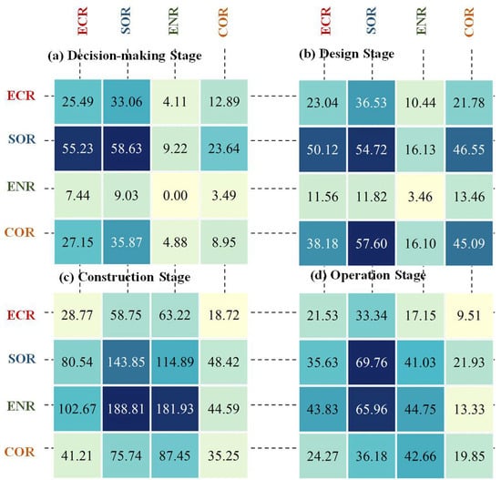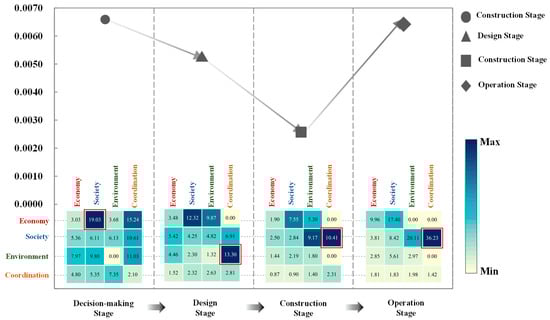 Compared with direct inter-group interactions, global inter-group interactions are stronger. For example, economic risk→coordination risk in the design stage, economic risk→coordination risk and environmental risk→coordination risk in the construction stage, and economic risk→environmental risk in the operation stage have little direct inter-group interaction, but have high global inter-group interactions. In addition, the close interaction relationship between the dimensions in direct inter-group interaction and global inter-group interaction is similar.