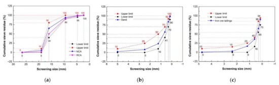 The grain gradation of coarse and fine aggregate: (a) coarse aggregate; (b) fine aggregate; (c) IOT.