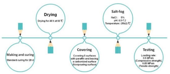 To simulate the chloride ion erosion characteristics of recycled concrete with tailings in salt spray environments, cube test blocks (100 mm × 100 mm × 100 mm) were used to test the salt spray erosion depth and change in ion content characteristics. To avoid the influence of multi-dimensional salt spray erosion on the erosion depth and ion concentration of the test block, a non-pouring surface was reserved as the salt spray erosion surface after the maintenance. The test process is shown in Figure 2.