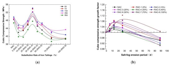 Figure 3b shows the change rule for the compressive strength growth coefficient to salt spray erosion age under the same iron tailings mixture ratio. It can be seen that the change trends of the compressive strength growth coefficient caused by salt spray erosion were similar. With the same tailings content, the increase in erosion time generally demonstrated the trend of the growth coefficient of the compressive strength first increasing and then decreasing. Most of the concrete that was mixed with tailings had a peak point at 14 days, but the increased value was relatively limited with most being below 10% and some being less than 4%. In addition, there were a few concrete mixtures with peak points at 28 d, such as RAC-7 (70%) and RAC-8 (100%). The main reason for this is that when the tailings content was high, the design mix ratio of the concrete changed, the porosity increased and the peak point was pushed back. At the same time, when the salt spray erosion age was 90 d, the tailings content was 100%. In this case, the compressive strength was also increased by 0.78% compared to 0 d.