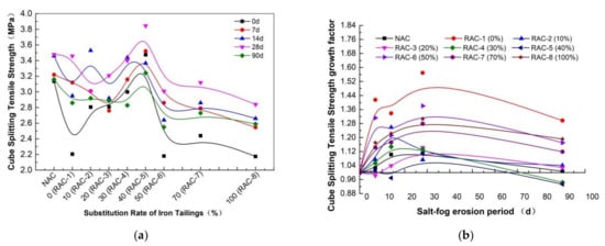 Figure 4b shows the increasing growth coefficient of splitting tensile strength with the increase in erosion age with the same tailings content. Compared to the growth coefficient of salt spray of the compressive strength of the cubes, erosion age had less of an effect on splitting tensile strength and the intuitive phenomenon was that the slope of the curve was relatively small. On the whole, the growth coefficient for the same tailings content occurred after salt spray erosion for 14 to 28 days. Similar to the growth coefficient of compressive strength, the maximum value of the growth coefficient for splitting tensile strength occurred at 28 d for the condition of increased porosity, such as with RAC-1, RAC-7 (70%) and RAC-8 (100%). The growth coefficient at the peak point was also greater than that of compressive strength. For example, the splitting tensile strength growth coefficient of RAC-21, RAC-6 (60%) and RAC-8 (100%) increased by 56.9%, 38.1% and 22.3%, respectively, at the maximum point.