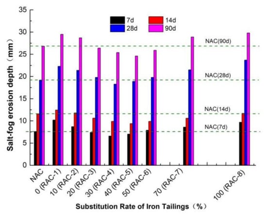 Figure 5 shows the erosion depth of the recycled concrete at different ages. It can be seen that the salt spray resistance of recycled concrete (RAC-1) was much lower than that of ordinary concrete (NAC) at the same erosion age. With the increase in IOT content, the salt spray erosion depth presented an approximate trend of first decreasing and then increasing, but the change trends were different. Approximately, when the tailings content was 30–40%, the erosion depth reached its minimum value. For example, after 90 days of salt spray erosion, the erosion depth of RAC-1 was 10.07% higher than that of NAC and the erosion depth of RAC-5 (uIOT = 40%) was 14.29% lower than that of RAC-1 (uIOT = 0%), indicating that the effect of an appropriate IOT amount on salt spray erosion was relatively obvious. The main reason for this is that the porosity of RAC was high and there were many interfacial transition zones, so salt spray could penetrate into the concrete more easily. As mineral admixtures, IOT particles are fine and have an obvious filling effect and activity, meaning that an appropriate amount could effectively promote the secondary hydration of cement particles and improve the pore structures and the compactness of the concrete matrix structures. As IOT replaced the fine aggregate in concrete, when the tailings content was too high, the optimal mix proportion of the concrete aggregate was, which led to an increase in the porosity of the concrete and a reduction in its anti-erosion ability.