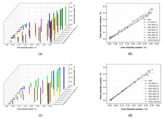 Mohammed [31] conducted a chloride ion erosion test on different cement types, cement components and concrete mixed with mineral powder, steel slag and other admixtures. It was found that the free chloride ion and total chloride ion contents conformed to the following formula: