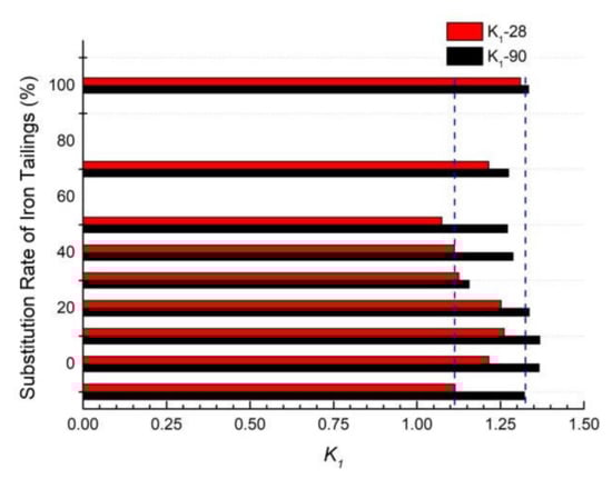 Figure 6a,c shows the location and size relationships of numerical points at the relevant erosion ages (28 d and 90 d), while Figure 6b,d represents the direct ratio relationships. Due to the low content of chloride ions, the position of powder collection and the density and permeability of the concrete had a great influence on the calculated chloride ion content. Compared to Figure 6a,c, the numerical points at the two erosion ages were in an approximately random distribution; however, it can be seen that the value of Cf > 0.35% when the figure was decreasing, indicating that the free chloride ion concentration (Cf) of concrete with the same tailings content gradually decreased with the increase in erosion time. As can be seen from Figure 6b,d, the ratio of free chloride ions to total chloride ions changed linearly (approximately and except for some scattered numerical points) and the curing coefficient K1 changed very little. Figure 7 shows the change laws of the curing coefficients of different tailings content conditions at different erosion ages.