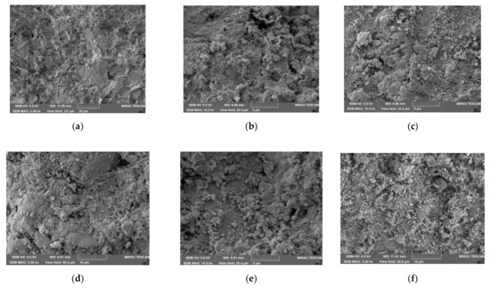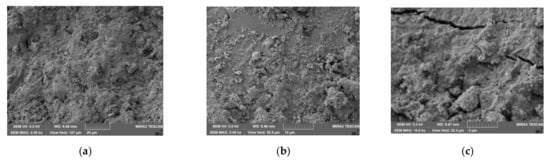 Combined with Figure 8d,f, Figure 9 shows the scanning microscopic morphology of SEM images of salt spray erosion on RAC with different tailings contents at 90 d.