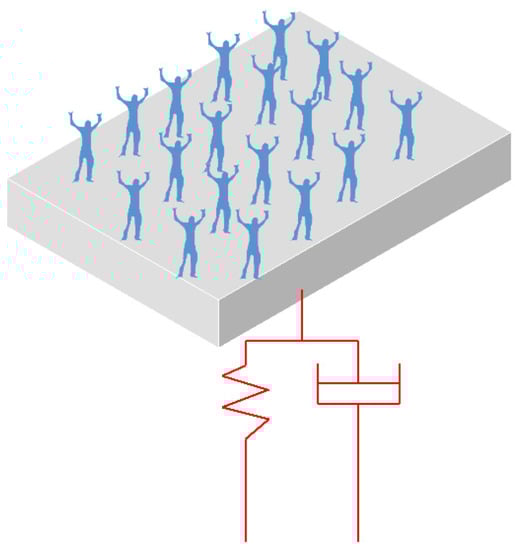 Currently, the modern assembly structures (e.g., large-span floor slabs, footbridges, grandstands, etc.), gradually exhibit the characteristics of low natural frequencies and low damping ratios, due to the extensive use of lightweight, high-strength building materials [,,,,]. Accordingly, structural vibration serviceability issues [,] as well as safety risks [,] caused by crowd activities have been increasingly emerging, which may further lead to huge economic losses and even heavy casualties in extreme cases. One typical example of this was the London Millennium Bridge in 2000, in which severe lateral vibrations of the bridge were induced by pedestrian use []. The bridge was therefore closed to traffic for three days after the grand opening, and it cost GBP 5 million to solve the vibration problem. Additionally, at a sports concert given in Vigo, Spain in 2018, the wooden stands collapsed due to the audience’s rhythmic activities, with over 300 people injured []. Jumping is usually considered to generate the most significant vertical loads in contrast to other common activities [,], in particular when the crowd is coordinated by an external beat. This will be the focus of this research.
