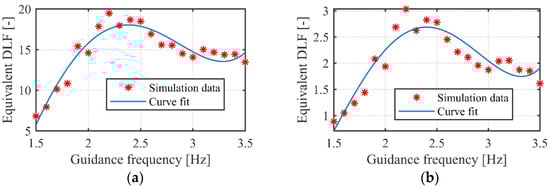 According to the definition of the standard working condition, the median of 1000 simulation data with a structural damping ratio equal to 0.005 and crowd size equal to 50 are adopted to build the model. The crowd reacts differently to different beats. This is also proven by the probability distribution of the jumping frequency, the probability distribution of the time lag shift, and the values of the coherency function magnitude, all of which are related to the guidance frequency. Therefore, the equivalent DLF of the standard working condition is related to the guidance frequency, as depicted in Figure 3, from which it is observed that the equivalent DLF increases first and then decreases with the guidance frequency. This is because it is hard for a crowd to keep up with the beat, and the jumping activity is exhausted when the guidance frequency is high or low. Particularly, the equivalent DLF at the low guidance frequency is only about one-third of the maximum value at the moderate guidance frequency. A fourth-order polynomial is used to model the equivalent DLF for the standard working condition, as depicted in Figure 3, in which Equation (17) is used for the first harmonic and Equation (18) is used for the second harmonic.