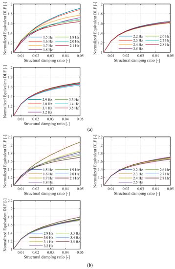 According to Equation (11), the structural damping ratio affects the equivalent DLF by changing the magnitude of the FRF. The bandwidth of the FRF increases as the structural damping ratio increases, so the contribution for the energy between different harmonics to structural responses increases. As a result, the equivalent DLF will increase with the structural damping ratio. Moreover, the influence degree of the structural damping ratio on the equivalent DLF is related to the PSD matrix. In particular, the impact degree increases as the bandwidth of the sum of the PSD matrix’s elements increases, because more energies are distributed between the jumping frequency and its multiplier, and these energies are weighted by the FRF to contribute for structural responses. First, the bandwidth increases as the jumping frequency increases, which is illustrated by the expression of the normalized PSD, i.e., Equation (15). Moreover, this bandwidth increases as the dispersion degree of the jumping frequency increases according to Equation (16). The dispersion degree of the jumping frequency is large at the low guidance frequency [], because many people cannot keep up with the beat. Consequently, the influence degree of the structural damping ratio on the equivalent DLF for different guidance frequencies is complicated. To further yield the influence degree, the median of the 1000 simulations with a crowd size equal to 50 is used to plot Figure 4, where the equivalent DLF is normalized by the equivalent DLF with a structural damping ration equal to 0.005.
