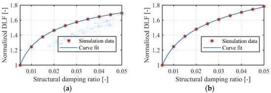 Relationship between structural damping ratio and normalized equivalent DLF. (a) Relationship for the first harmonic, (b) Relationship for the second harmonic.