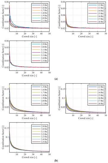 Owing to the inter-subject variability, the equivalent DLF is not proportional to the crowd size. In existing models, the crowd DLF divided by the crowd size is defined as the coordination factor to quantify the crowd synchronization [], because the coordination factor tends to be a constant as the crowd size increases, which makes the modeling of the crowd DLF easy. Learning from this idea, the coordination factor, coi, in this section is defined as: