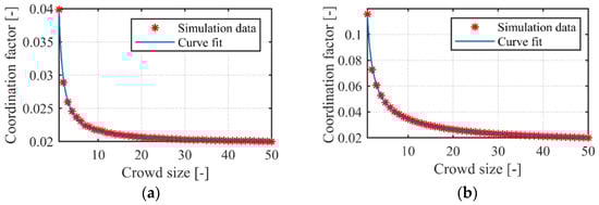 Relationship between coordination factor and crowd size. (a) Relationship for the first harmonic, (b) Relationship for the second harmonic.